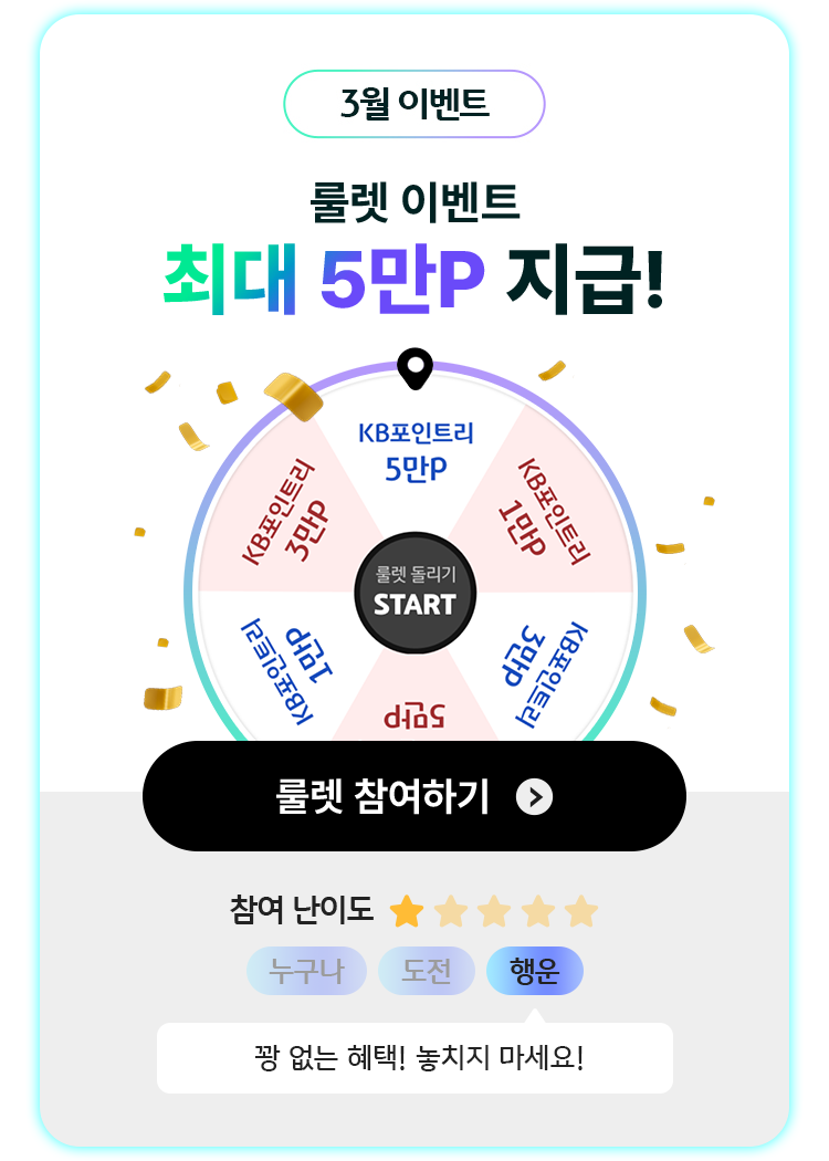 - KB신용카드/체크카드 미보유 고객의 경우 포인트리 적립 및 사용을 위해 KB PAY 앱 가입(만 14세 이상)이 필요하며, KB Pay 앱 미가입 사유로 포인트리 수령이 불가능할 경우 지급 제외 됩니다.